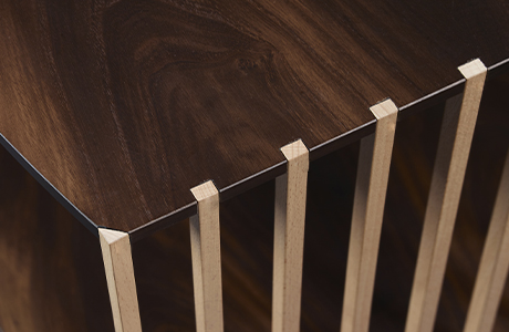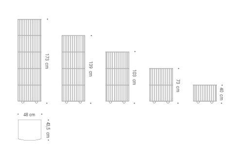 A bookcase designed for the centre of a room, made of a lining of solid-wood baguettes that are rounded off and joined to countertops through invisible joints. The result has impressive structural strength while looking light and airy. With spherical-shaped feet.