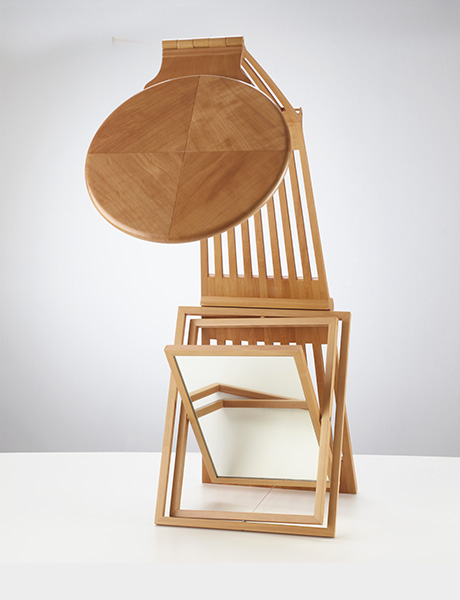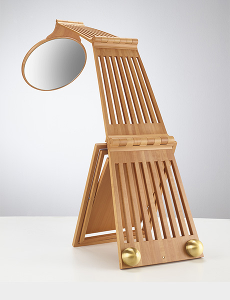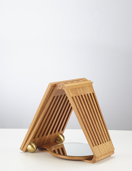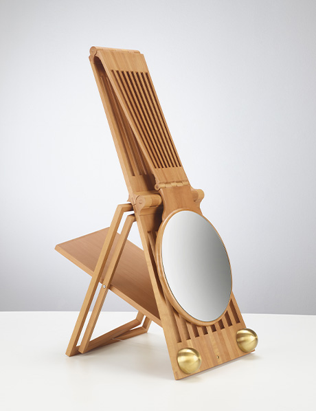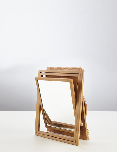 An object characterized by a great evocative power, Pierrot is an iconic Bottega Ghianda piece, designed by Pierluigi Ghianda himsel. Pierrot, here it lends its name to another symbolic object in theatre, which is capable of illustrating the evolving nature and the thousand nuances of the self: the mirror. Fodlable, portable, double-sided mirroring made of strips of solid wood of either pearwood or beechwood. The hinges are made of solid wood, present brass details in order to regulate the movement of the main mirror. Pierrot is a limited-edition piece, only available upon request.